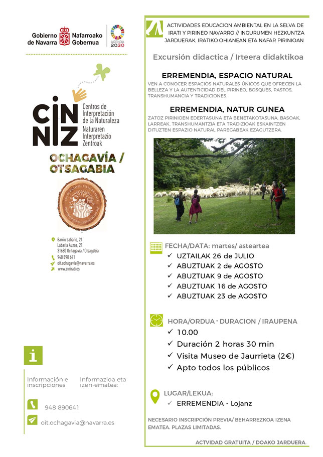 § ERREMENDIA, BOSQUES, PASTOS Y TRADICIONES: DÍAS : 26 JULIO. 2, 9, 16, 23 AGOSTO/ Hora: 10.00/ Punto Encuentro: Merenderos de la fuente de Lojanz. Erremendia./ Duración:2 horas 30 min/ Incluye Visita Museo Jaurrieta /Precio: 2€ Entrada Museo /NECESARIA INSCRIPCIÓN PREVIA