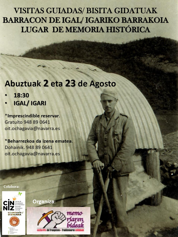 § Lugares de Memoria Histórica , Barracón de Igal: Días : 2 y 23 AGOSTO / Hora: 18.30/ Punto Encuentro: IGAL./ Duración: 1 h /Precio: Adultos: 1€ - Menores: gratuito / Organiza: MEMORIAREN BIDEAK
