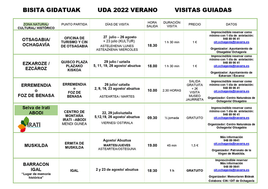 § Otsagabia: 27 JULIO AL 26 AGOSTO. Días: LUNES /MIÉRCOLES Hora: 18:30/ Punto Encuentro: Oficina de turismo /Duración: 1 h 30 minutos/ Precio: Adultos: 1€ -Menores: gratuito/ Organiza: AYUNTAMIENTO OCHAGAVÍA/ OTSAGABIA