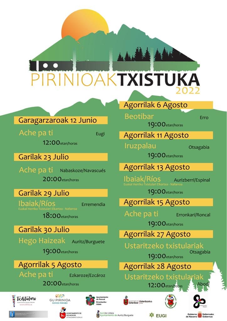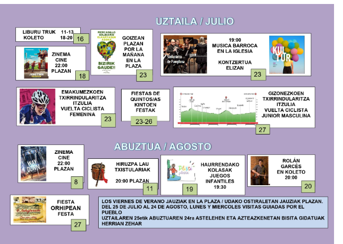 § Ezcároz : DÍAS : 27 JULIO. 5, 11, 19 y 26 AGOSTO /Hora: 18.00/ Punto Encuentro: Quiosco música plaza/Duración: 1 h 30 minutos/Precio: Adultos: 1€ -Menores: gratuito/ Organiza: AYUNTAMIENTO EZCÁROZ / EZKAROZE
