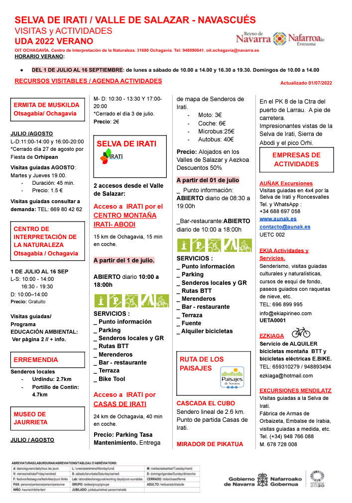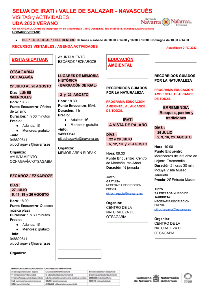 § IRATI A VISTA DE PÁJARO: DÍAS : 22 y 29 JULIO. 5, 12, 19 y 26 AGOSTO / Hora: 09.30 / Punto Encuentro: Centro de Montaña Irati-Abodi /Duración: ½ jornada / GRATUITA /NECESARIA INSCRIPCIÓN PREVIA oit.ochagavia@navarra.es / Organiza: CENTRO DE LA NATURALEZA DE OTSAGABIA